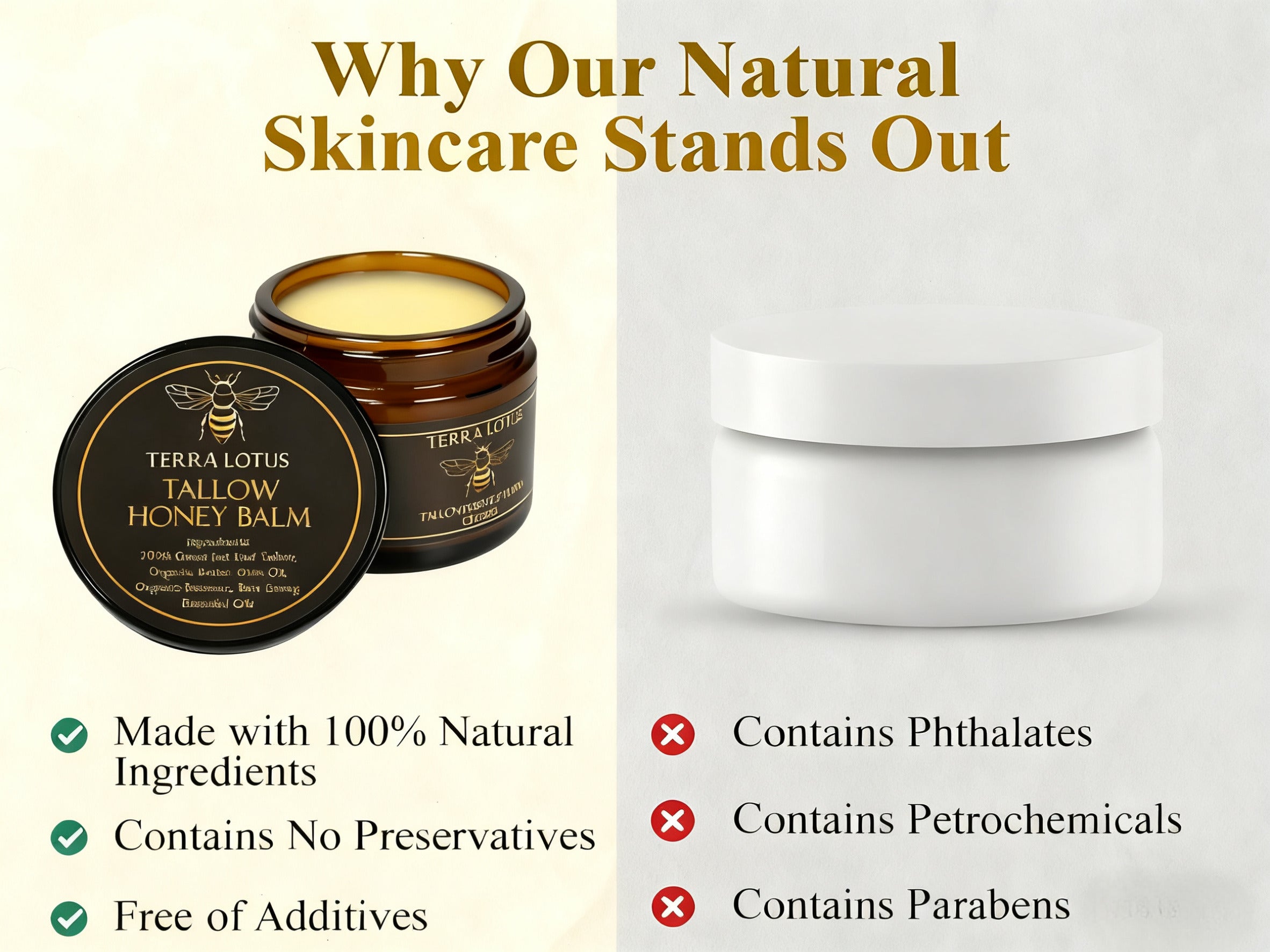 Unlike traditional moisturizers that may contain synthetic ingredients and additives, our tallow balms are crafted with pure, natural ingredients. Tallow closely resembles the structure of human skin lipids, allowing for better absorption and hydration.